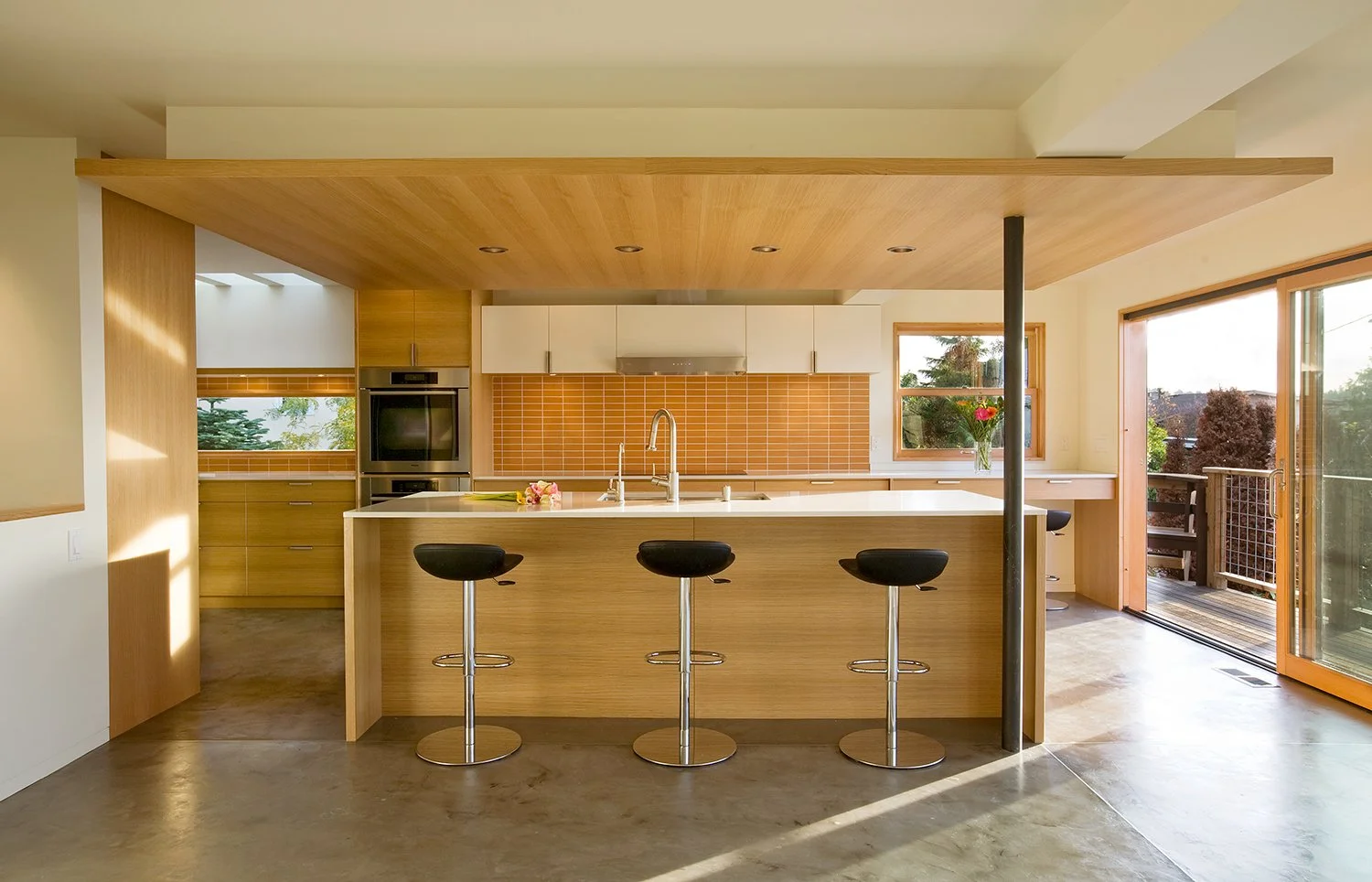 The kitchen, originally dark and isolated from the dining and living rooms, is now the heart of the house. Interior walls around it were removed to take advantage of views and light and to integrate it with adjacent spaces. A large island cabinet was designed as a practical workspace and social gathering spot with seating on one side. A wood-clad panel hovers over the island and part of the dining engaging both spaces and adding texture and color while hiding the unsightly existing ceiling structure. A large sliding door was added for easy access to the deck and to bring in natural light.